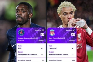 登贝莱vs埃基蒂克本赛季欧冠每90分钟数据:前者进球、助攻均占优