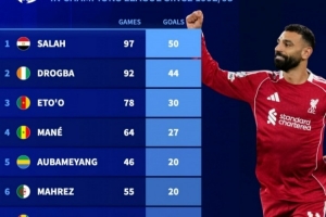 体育资讯3月19日讯 在欧冠淘汰赛次回合,利物浦4-0大胜加拉塔萨雷,萨拉赫破门,打进个人生涯欧冠第50球,以下为非洲球员在欧冠改制后射手榜: