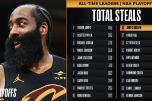 这样一来,哈登生涯季后赛至今已经送出288次抢断,超越克里斯·保罗(287次),升至季后赛历史第11位!